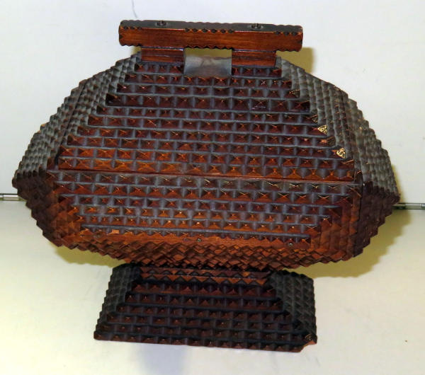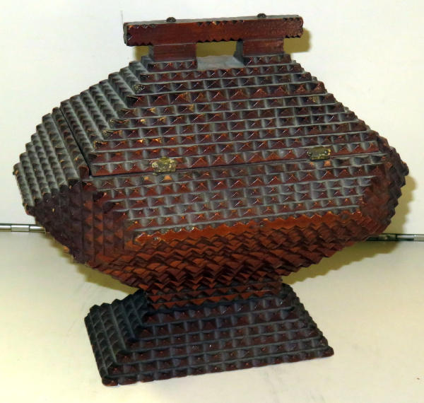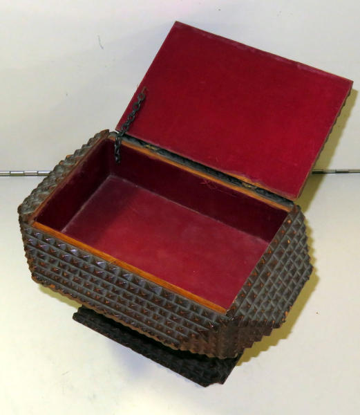 hinged lid w/satin lining; 8.25"x7.5"x6"; has chip out of the bottom corner; stamped on bottom