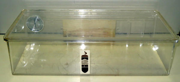 has a humidity dial inside; heavy plastic with hinged top lid; 21"x10"x6"
