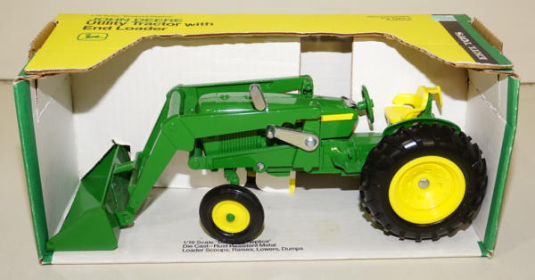 round hood, strobe decal, no headlights, pressed steel loader bucket; toy is mint and box is really nice and clean