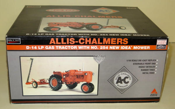 NIB, diecast tractor, resin mower, box is faded and has some wear