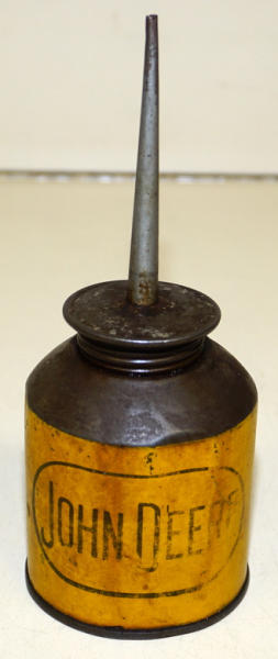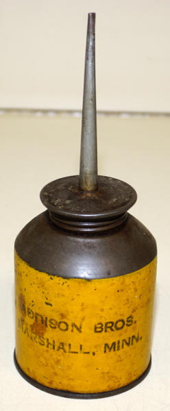 Rare color, decent original, dent above the logo; I think this is one of the first yellow cans I've seen with a dealer name; most of the yellow ones are plain