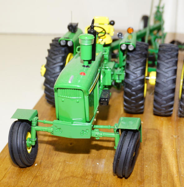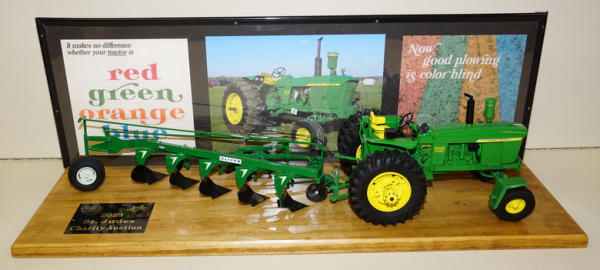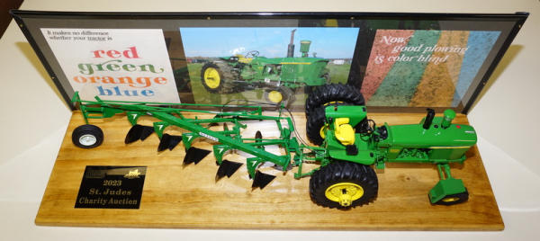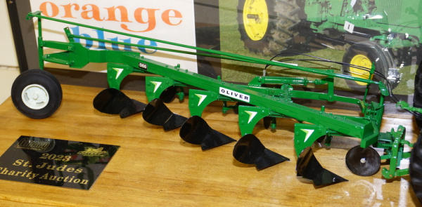 High-Detail model, custom Firestone Deep Tred tires, duals on the left side for plowing, accessories added to the tractor include front fenders, wheel weights, fender radio, frame toolbox & axle hub; Plow is a high-detail, all scratch built plow designed by Gene Ficken; all on a commemorative plaque with copies of the original Oliver promotion as a