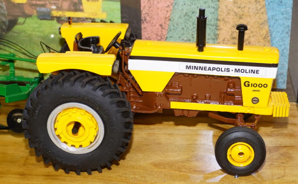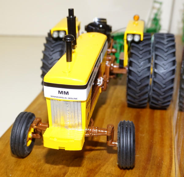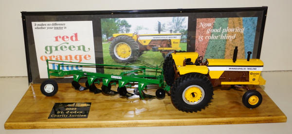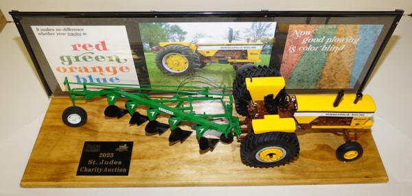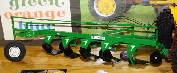 Custom built tractor by Shawn Beauprez, Firestone All Traction tires, wheel weights, lights, levers, & more, duals on the left side for plowing, accessories added to the tractor; Plow is a high-detail, all scratch built plow designed by Gene Ficken; all on a commemorative plaque with copies of the original Oliver promotion as a