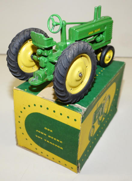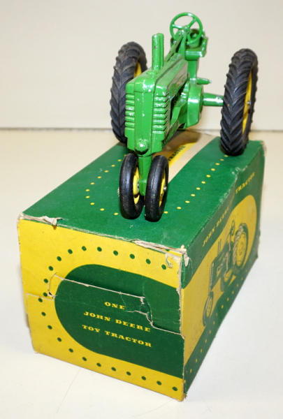 tractor is 90%+ condition with some normal paint chips; looks like the rear axle pin has been replaced; box is complete with good color, some tears and wear to the corners; box rates 7.5 condition