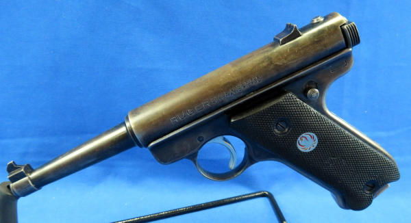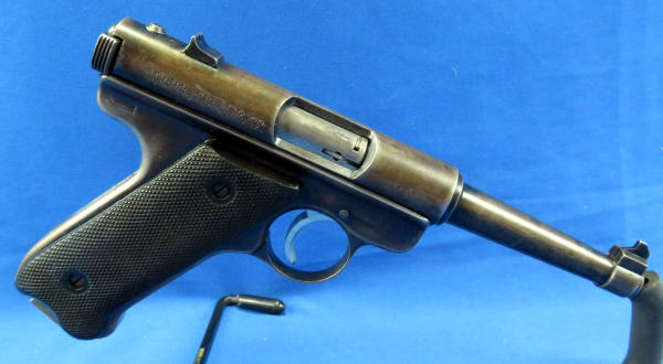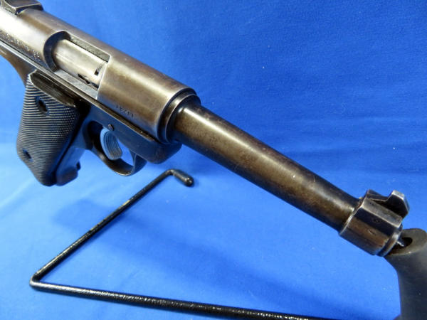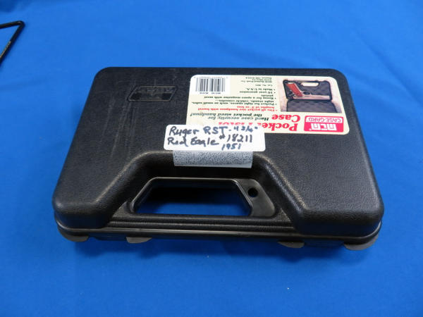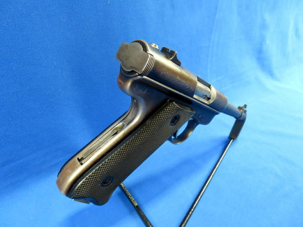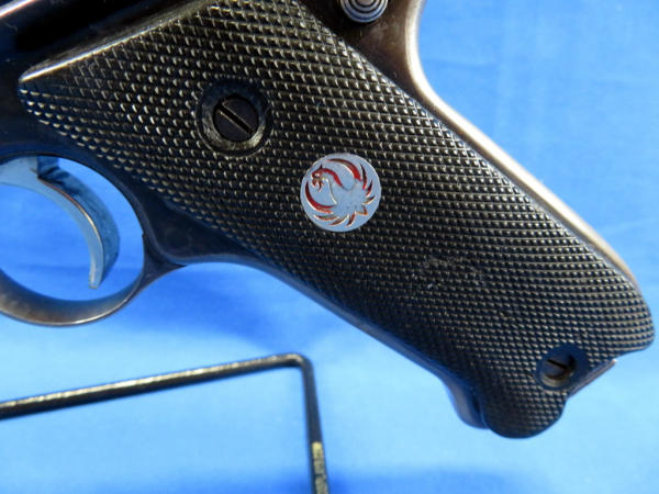 4.75" Tapered BBL; bluing very thin; gun has some wear; one magazine; comes with a hard case; hard rubber checkered grips; fixed sights; made in USA; SN#18211
