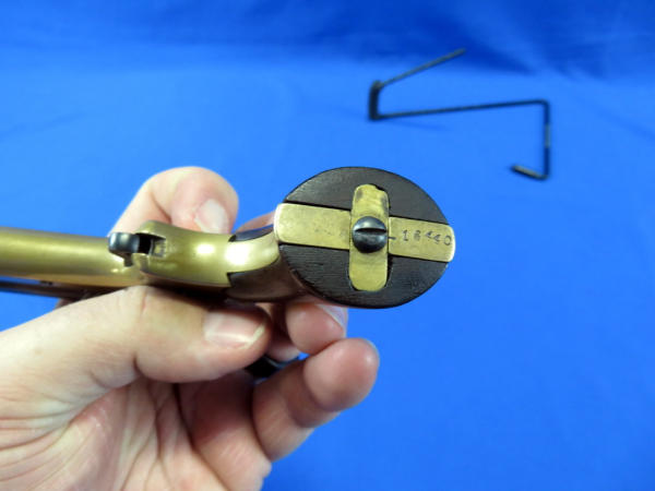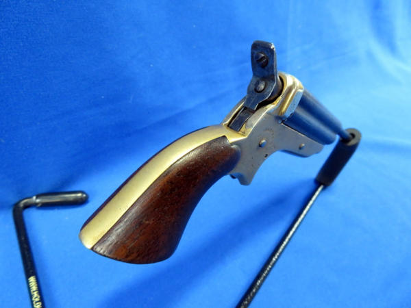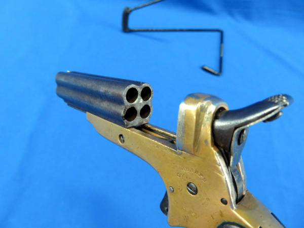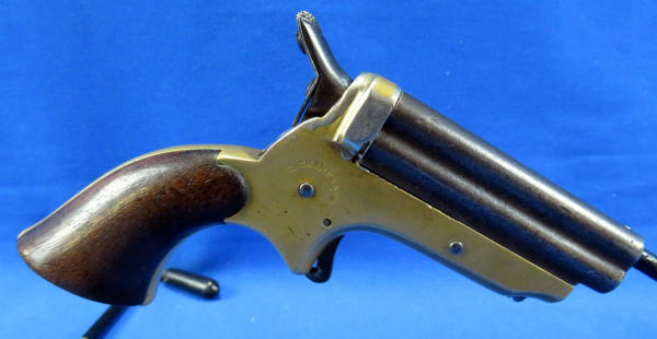 2.5" BBLs; brass frame; wood grips; spur trigger; barrels slide forward easily; has some finish wear but a nice example of an early firearm; SN#16440
