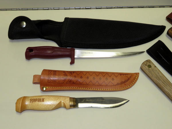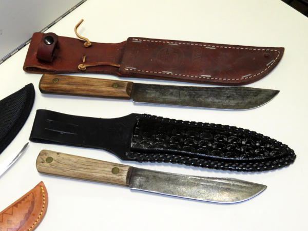 Fillet knives look like new; butcher knives are used; all have sheaths; sell for one money