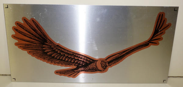 not sure what brand it's for, looks like an eagle but the head looks closer to a vulture or turkey; new; tin; 20"x10"