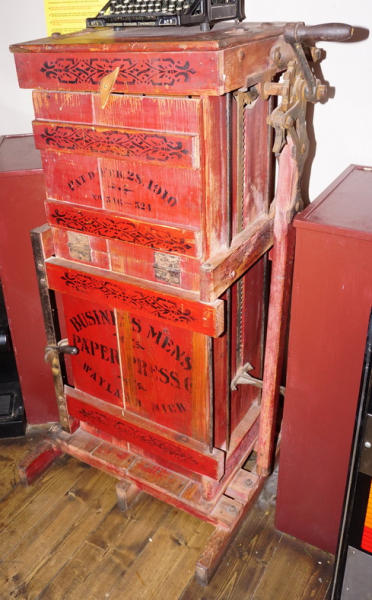 54" tall, base is about 26"x30, super nice original lettering and paint, believe this was used to bind together newspapers, very cool