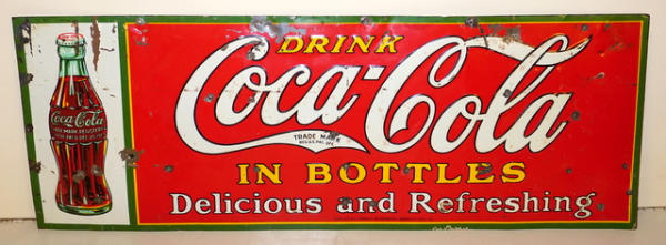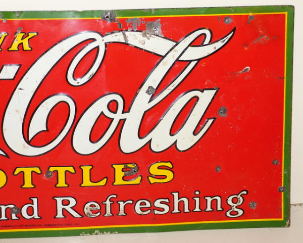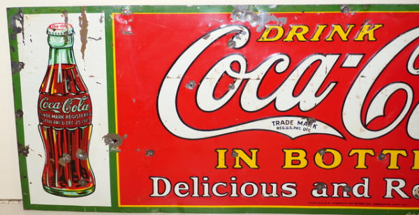 10"x27.5", some paint chips and few extra nail holes, early & rare original Coke sign