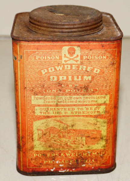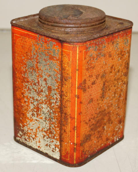 5.5" tall, 3"x3" square, heavy wear, but really unique tin