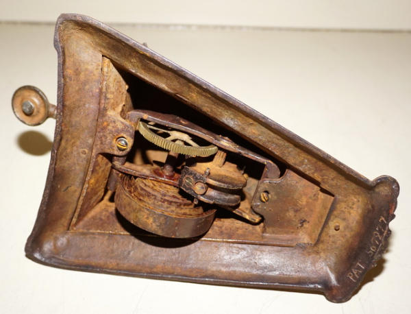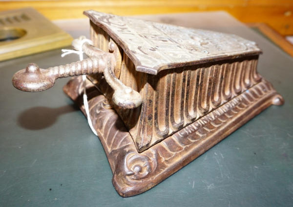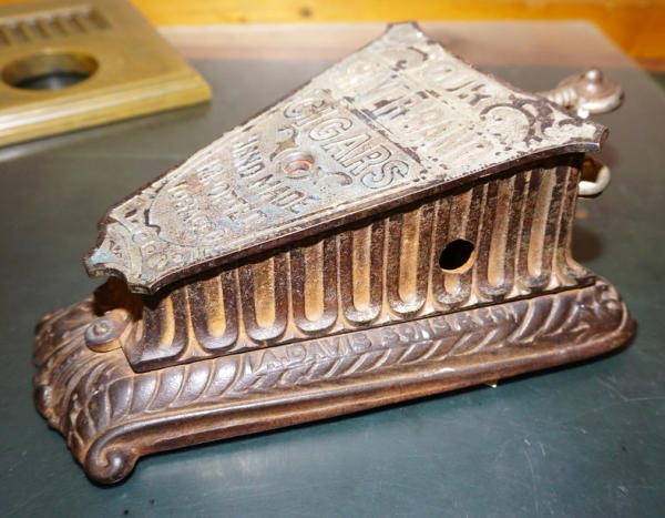 about 11"x7"x4", nickel plating is about 50%, mechanism looks like it's froze up, unique piece