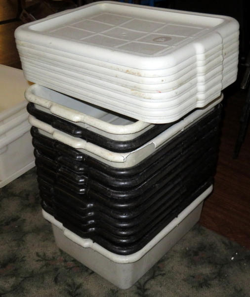 several tubs have cracks or damaged handles; 13 tubs, 12 lids; 19"x15"x7"; sell for one money