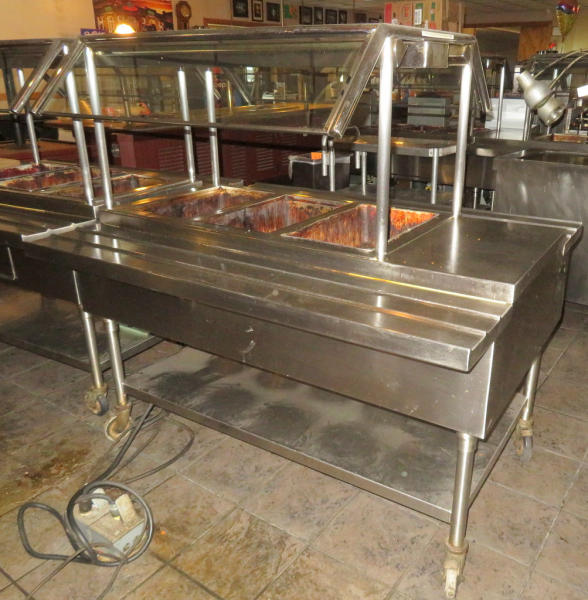 double sided serving; 3-compartment; stainless steel; nice condition; work; 60"x48"x60"; glass sneeze guards