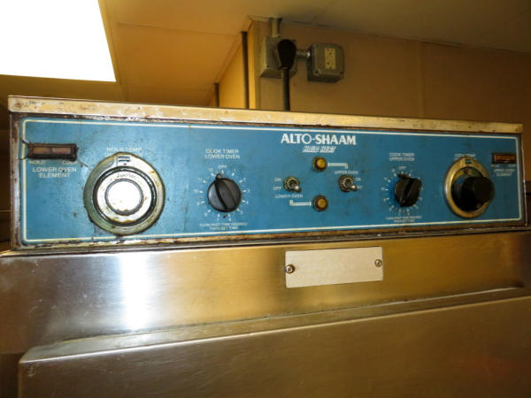 will warm but won't cook; bottom unit does not function; on wheels; 23"x30"x77"