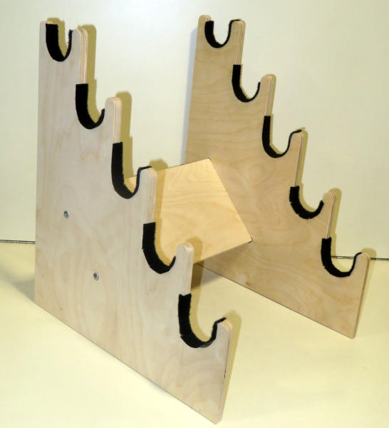 holds 5 longs guns; made of wood; 17.5" tall & 12" wide;