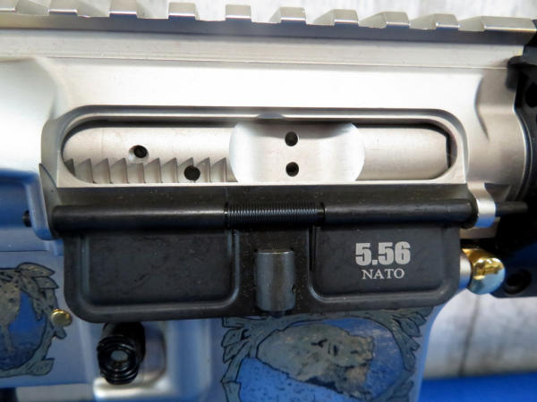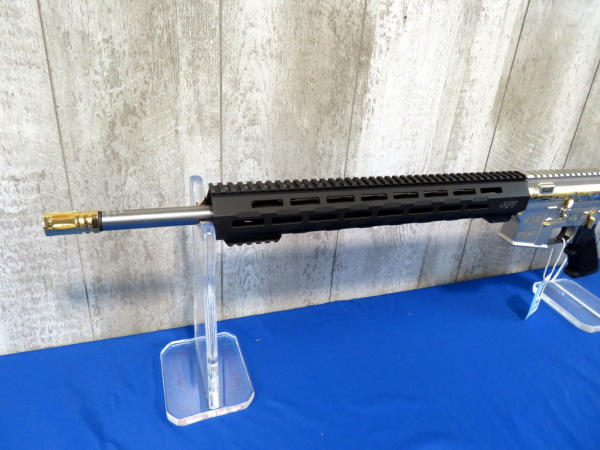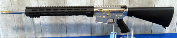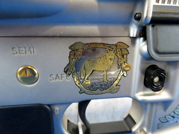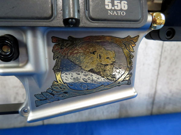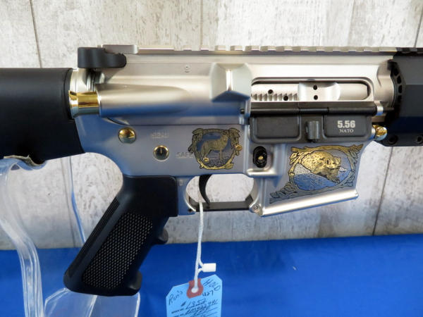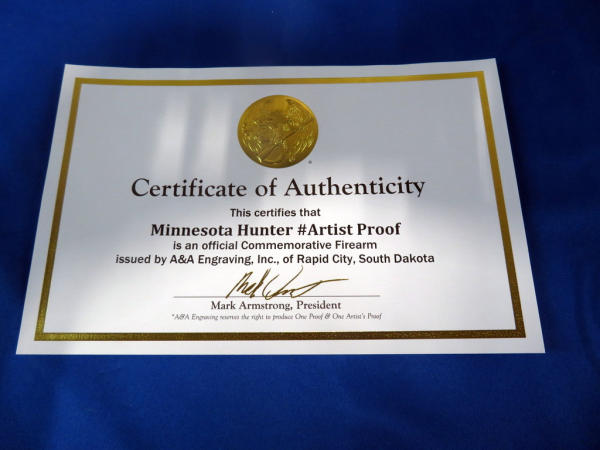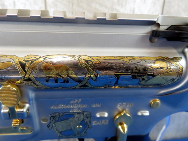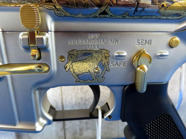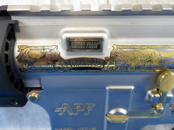 Another beauty engraved by A&A Engraving w/gold inlay; depicts Minnesota wildlife and hunter; 20" stainless barrel; gold accents; original box & COA; SN#AM022991 (AR/Tactical)
