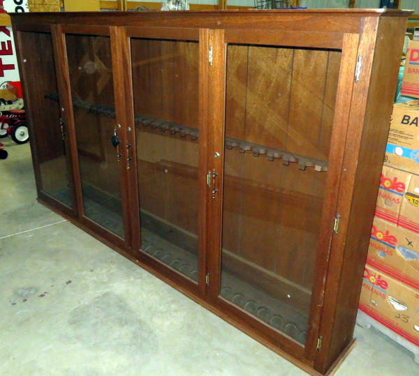 a couple of the holders are broken inside; has four glass doors all with lock & key; measures 98"x56"x11"; mounts flat against the wall; great cabinet to display your commemorative collection! NO SHIPPING, local pickup only