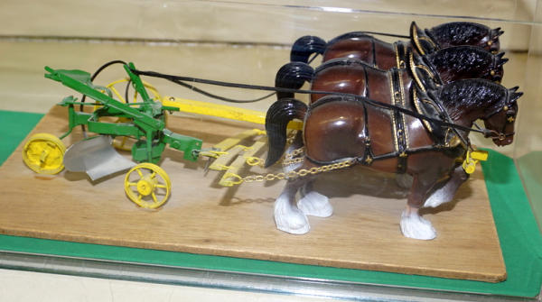 mounted to a wood base, about 1/16th scale, comes with a plastic showcase to display