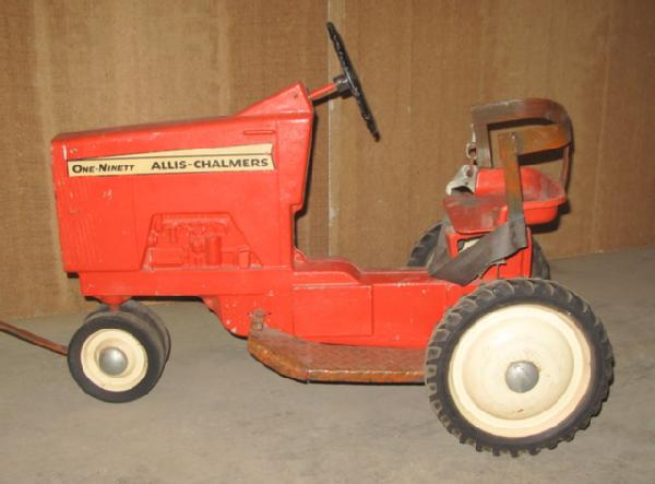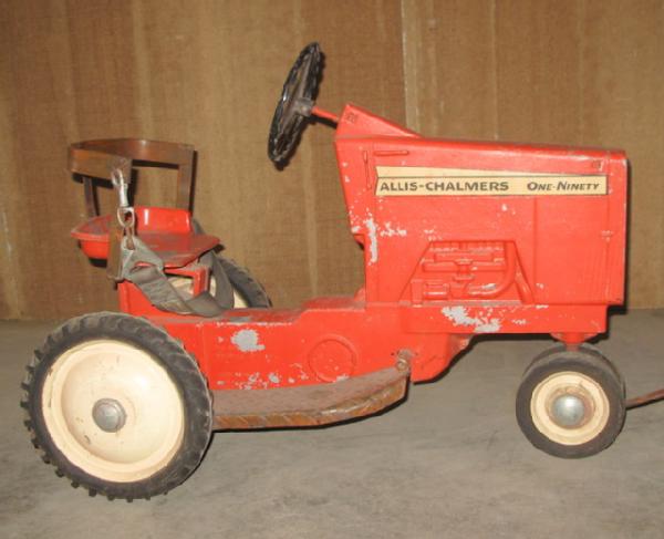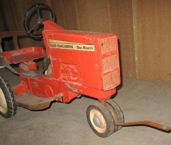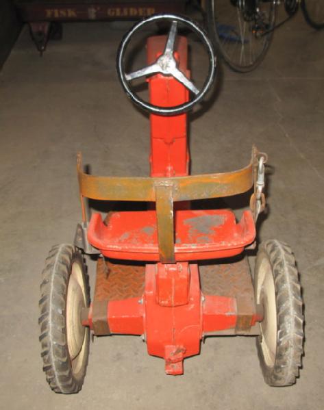 Nice original pedal tractor casting, but has no pedal assembly. This and the next two lots came from a small town in Nebraska and were used as a carnival ride back in the late 60's through the 1970's. They turned on a turntable, so the wheels are A-1 and next to new, has had a safety seat bracket added and foot rests along with a bracket on the front end. They wouldn't take much to restore back to original or leave as they are for a super unique piece for your Toy Collection
