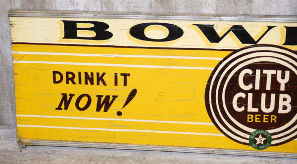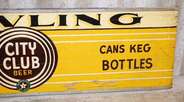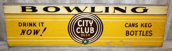 21"x74", has top and bottom frames, original paint is flaking a little, but good color and was probably an inside sign, overall has a great look and possibly a "one of a kind" piece for the City Club collection!