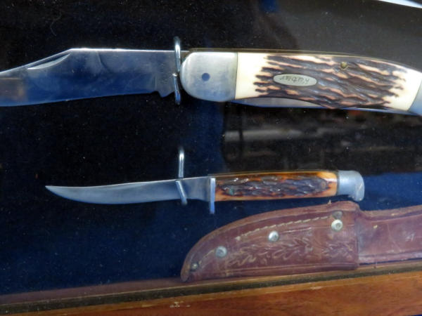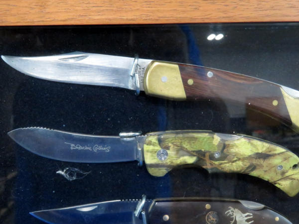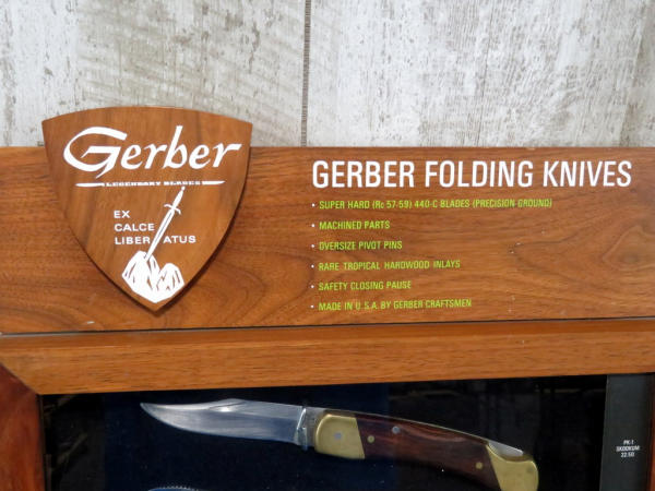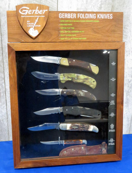 the knives are not Gerber but look good in the display; knives are Western, Kabar, Remington, Colt, Mossberg, Uncle Henry; wood w/glass front; easel back and opens from back side; 20"x14"