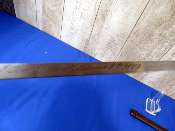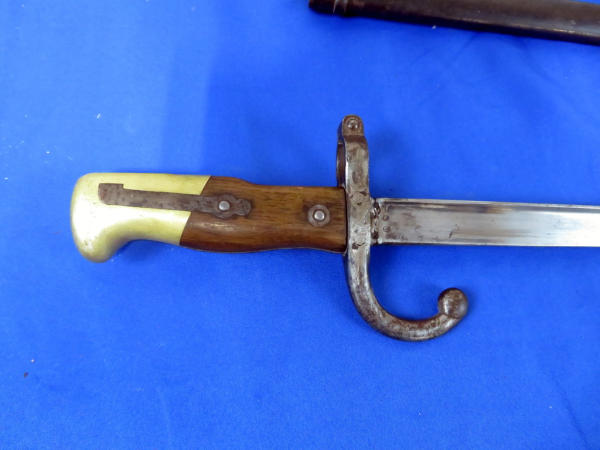 20" blade; Hard to read the script on top of blade, "Mre L'Armes de St. Etienne 8th 1879"; blade has been broke off handle and poorly repaired; early bayonet