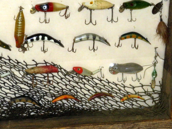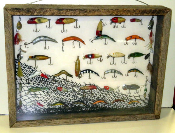 Great looking display with some awesome vintage lures! Mounted to the inside w/some fish netting, glass face, 24"x18"; includes Heddons, Lazy Ikes, Spinners, Mouse & More! NO SHIPPING, Local Pickup only