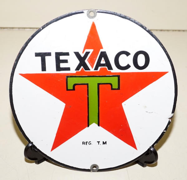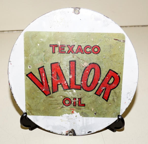 8" diam, has a chip on the left side about 3 o'clock and some small scuffs; original TEXACO Valor Oil Decal on the back