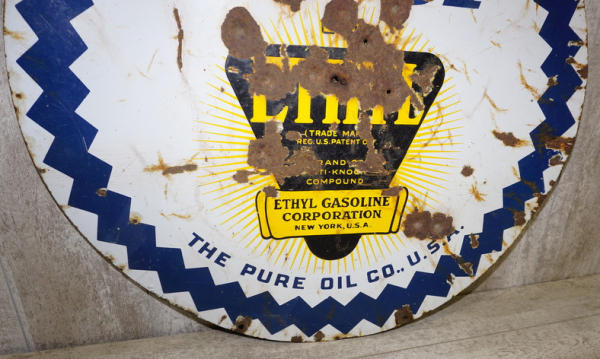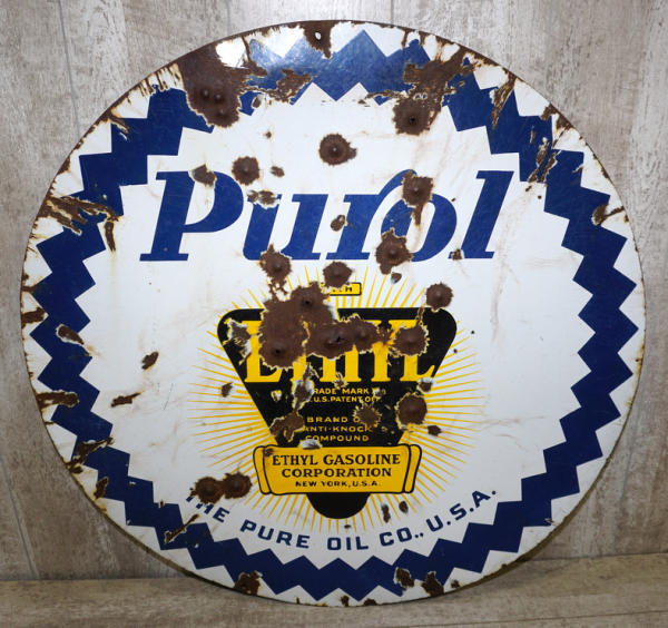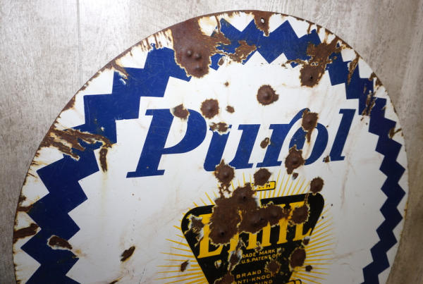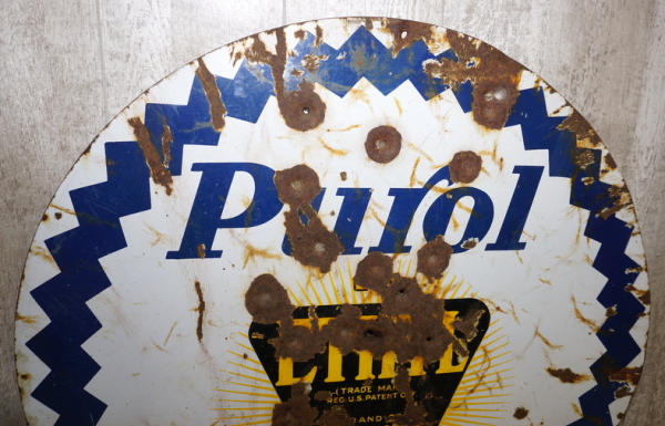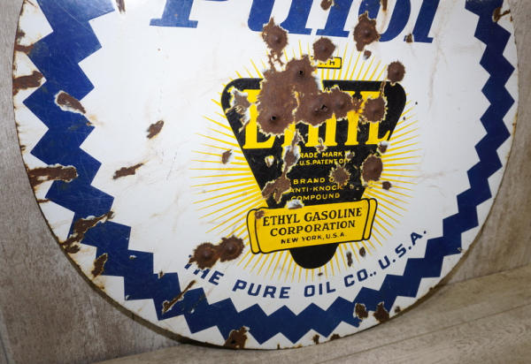 30" diam, several bullet holes and large chips, rough, barn hanger