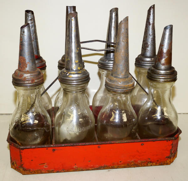 all generic bottles, a few have new decals, steel carrier is rusty and worn, looks like it sat in water, patina set