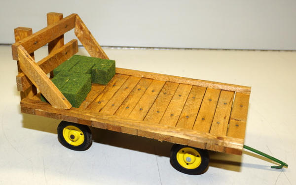 old JD gear nicely repainted, bed is wood, comes with some bales, looks good