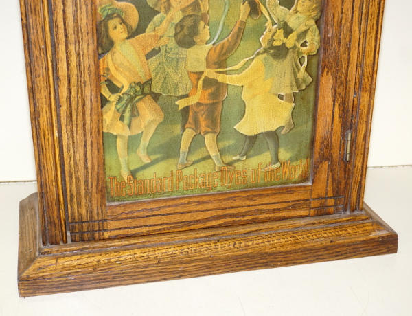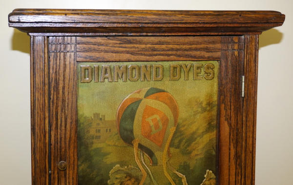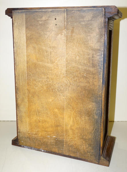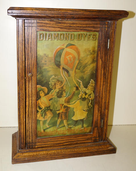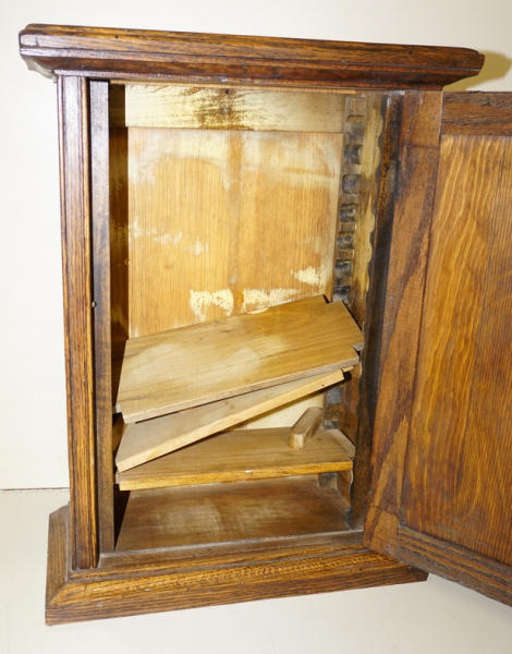 26"x19"x8.5"; looks to have been refinished at one time, original sign in the door has discolored with age, has shelves inside,