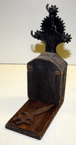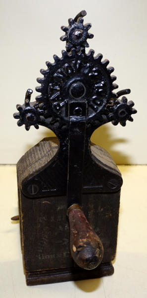 3-strand, original wood base with the stenciling from Sioux City, IA; looks like the iron part has been repainted, includes the original "wrench" tool too