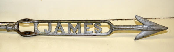 32" long, 13" tall, has an old repair around the top of the leg, old repaint, overall looks great, large & impressive arrow