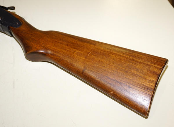 Wood stock, plastic forearm, some light wear, but overall a nice and hard to find original