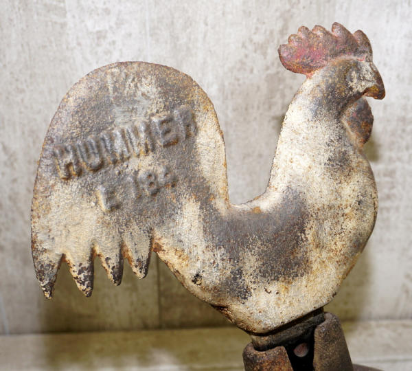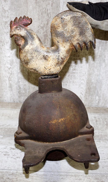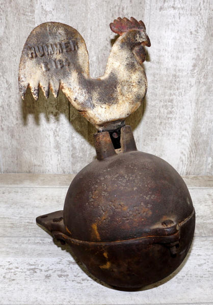 about 20" tall overall, Chicken comes off the ball, marked "Hummer E184", chicken has some old paint on it, ball is original paint; ball has a piece broken off the bracket