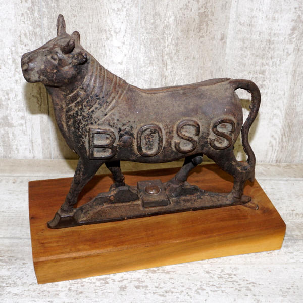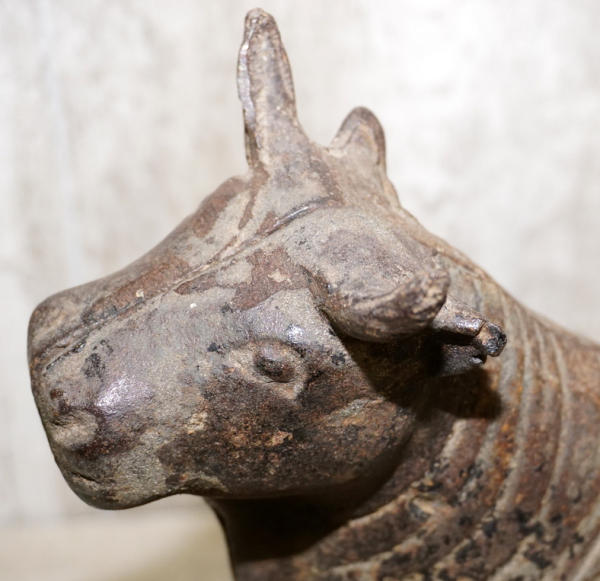 15" long, 13" tall; tip of the left ear is missing, doesn't look broken off, looks to have been casted that way, on a heavy wood block to display; believe it's an old original, but not 100% sure