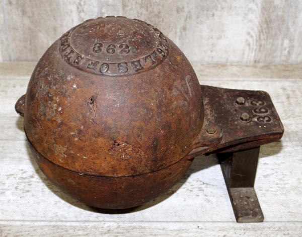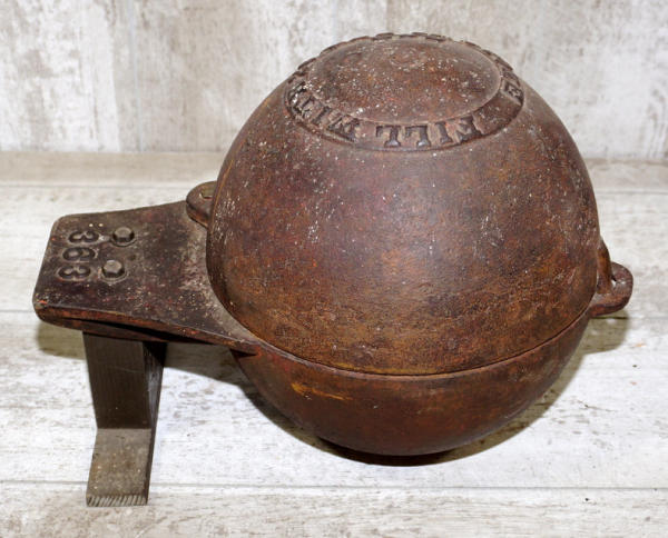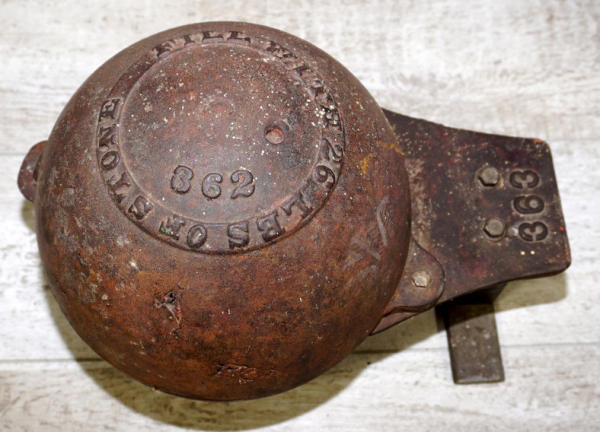 marked "Fill with 26lbs of stone 326", about 9" across, barn fresh patina