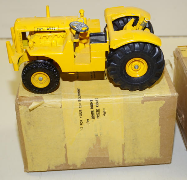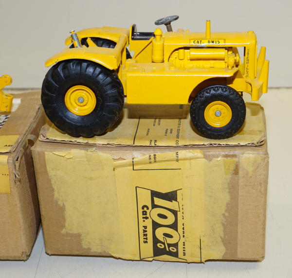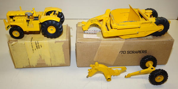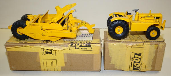 Tractor is nice original, 95% condition with some wear around the 5th-wheel hitch pin, plastic rims on both toys and unusual decals on the tractor (not the engraved hood like most); Scraper has a little more wear, maybe 90% condition; correct original brown boxes that were taped shut with original packing tape from a CAT Dealer in Montana; has the 1955 postage stamp on the top and mailing label to Paplan, Mont.; overall a really great set;