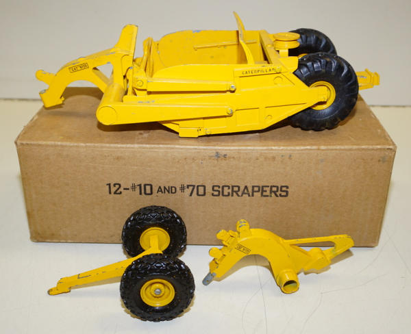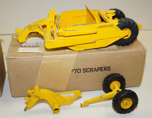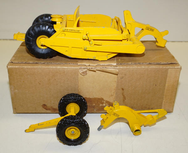 Scraper & Dolley hitch, both pieces are about 90% condition with some chips; nice original brown box, includes the original instruction seat with some wear too