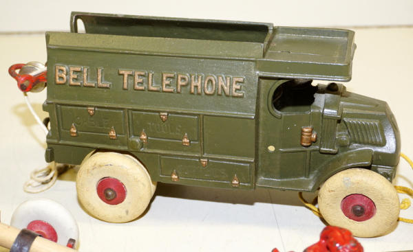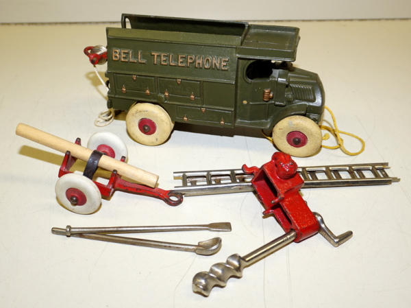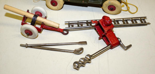 Truck is 10" long; I think professionally restored and really nicely done; original wheels, original post hole digger is a hard to find accessory; new wheels put on the pole trailer; might be a really nice original, but I think restored
