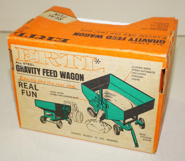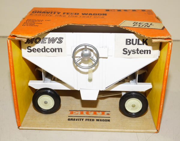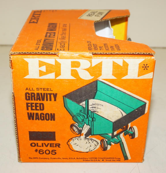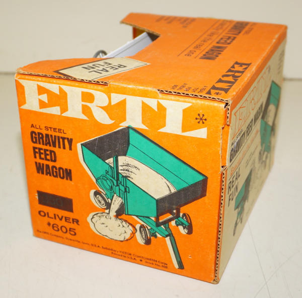 Mint original toy, near mint original box marked OLIVER; When these were produced, if you bought a full wagon load of beans from Moews, they would give you the gravity wagon plus gave the kid a toy wagon; very short run, I'm sure Ertl just used whatever boxes they had laying around to put the toy in; Rare toy, super rare box, we have never offered a boxed Oliver Gravity wagon