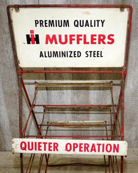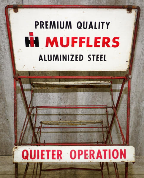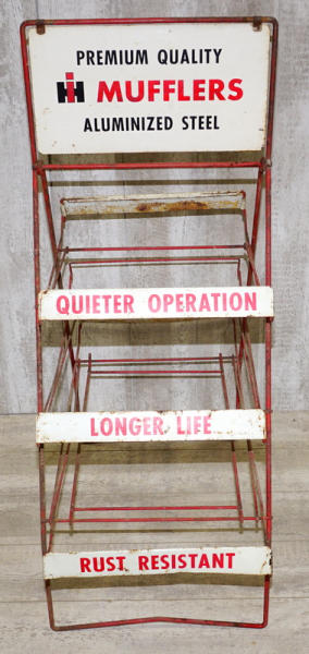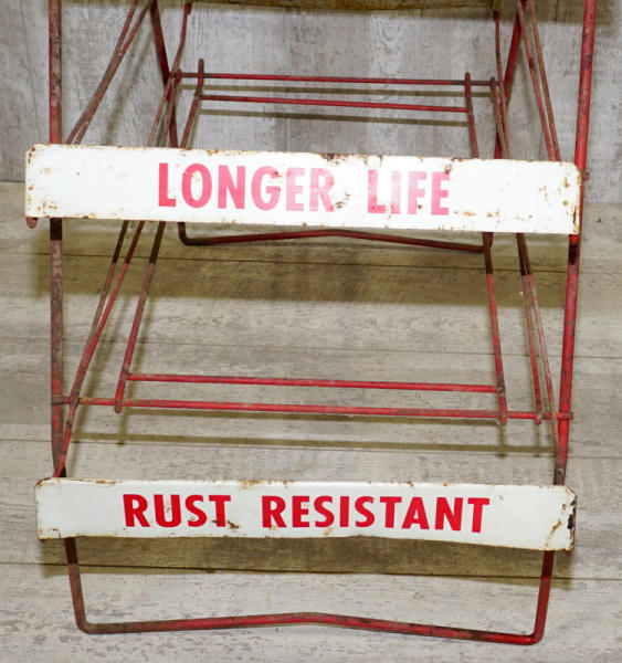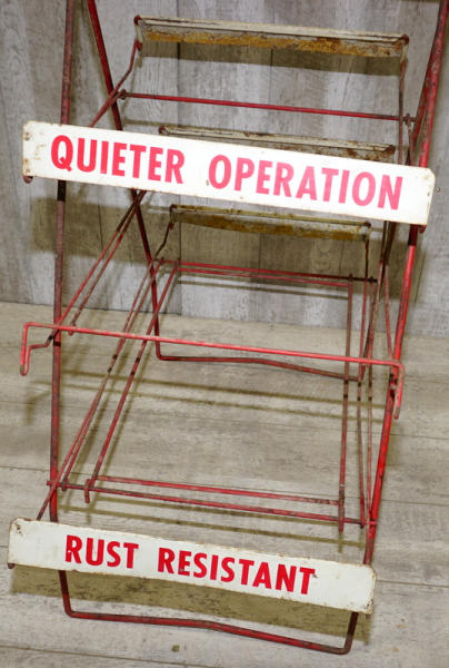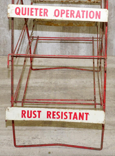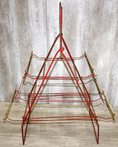 Overall 34"x43"x16" wide, double sided sign at the top is 16"x9"; missing one of the rider signs on one side of the rack, barn find condition, we gave it a quick wipe down, but would benefit from a detailed cleaning; never seen or sold one of these that I can recall; will fold flat for easier shipping