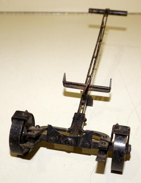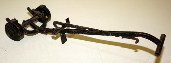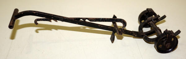 about 15" long, all steel & brass, black finish is original but worn, looks like a barrel or drum moving cart