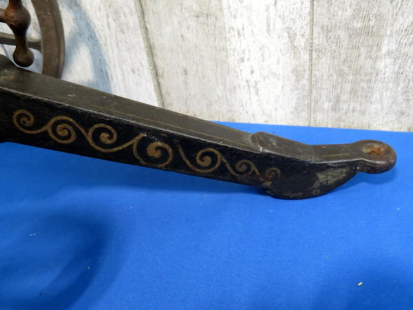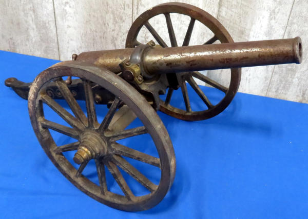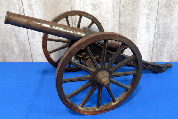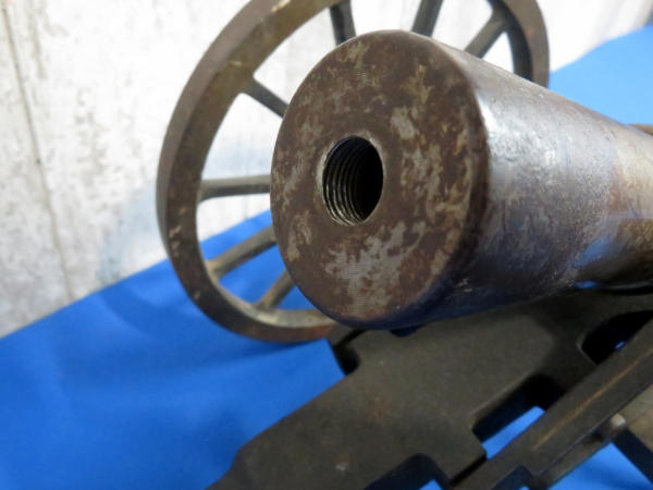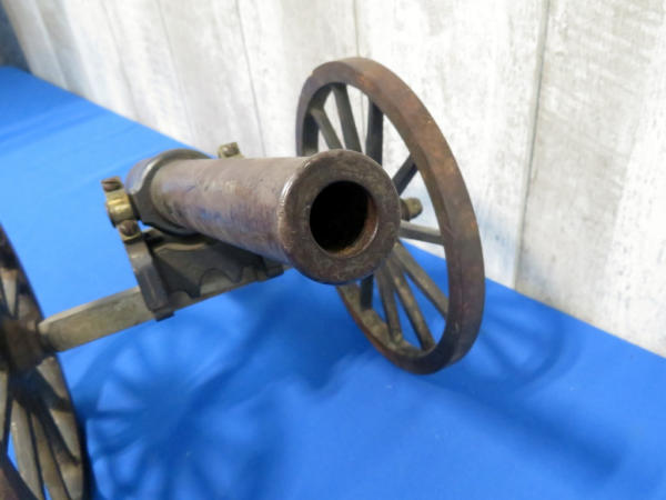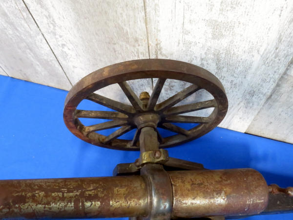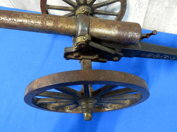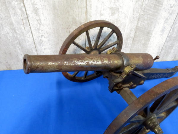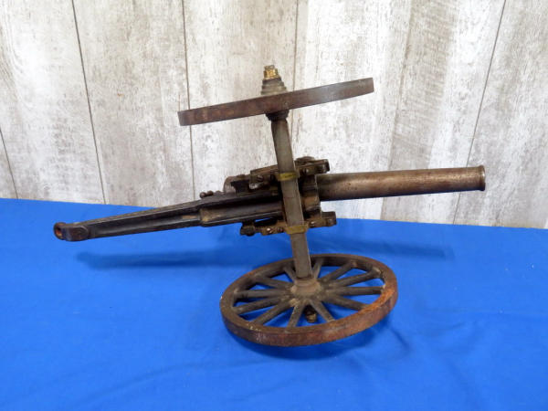 can't find any markings of any kind, but I guarantee it's old and probably from the 19-teens or maybe older; entire thing is 22" long and barrel is 13"; back unscrews and has firing pin; muzzle is about 16ga. Size; heavy steel wheels and other brass accents; neat old piece and would make a great addition to the man cave!