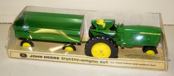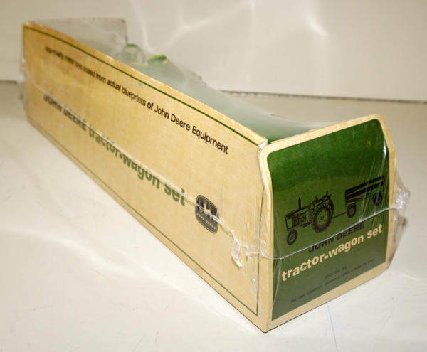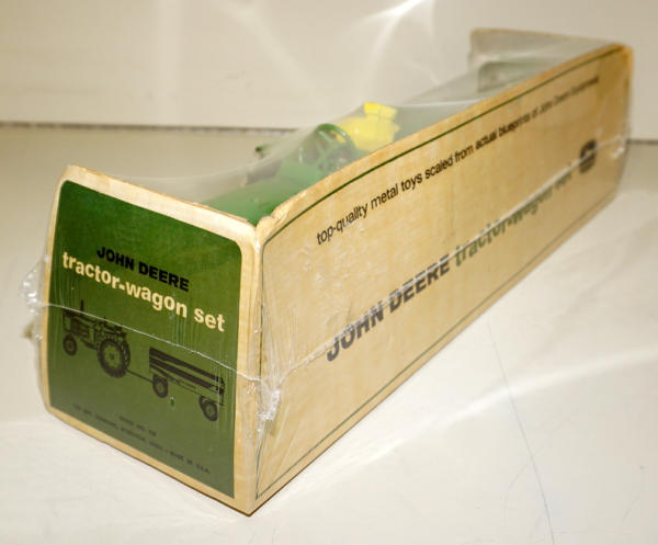 Tractor has short filters, 4-levers and narrow plastic rims; looks to be mint condition, plastic rim wagon is mint; Box has a new bubble, box is a little discolored from age, but still looks good, rates 8 condition