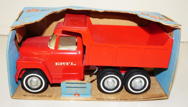 Cast-in grill, ERTL Door decals, & Tru-Scale hubcaps, mint toy, box has fairly heavy wear & discoloration, rates 6.5 condition