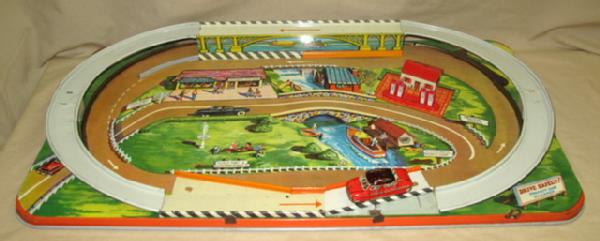 Track is 27"x15", don't know maker, includes a small car, don't know if it's original to the set, has light wear, nice graphics