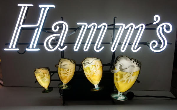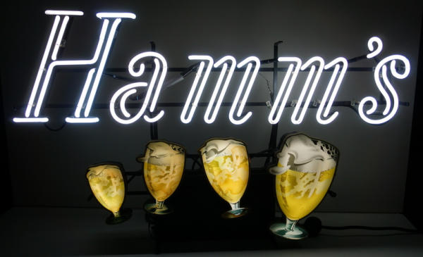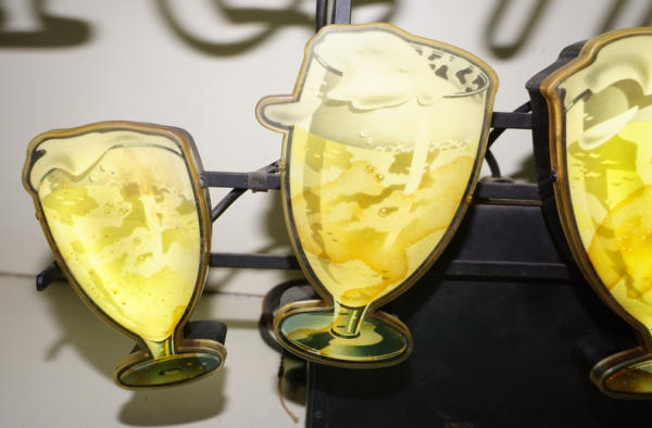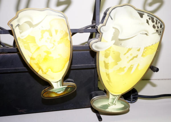 about 38"x24", works like it should, but it is a little noisy; goblet covers have some discoloration, but not bad, colors are bright and looks A-1 when lit up; very heavy; no shipping, local pickup only